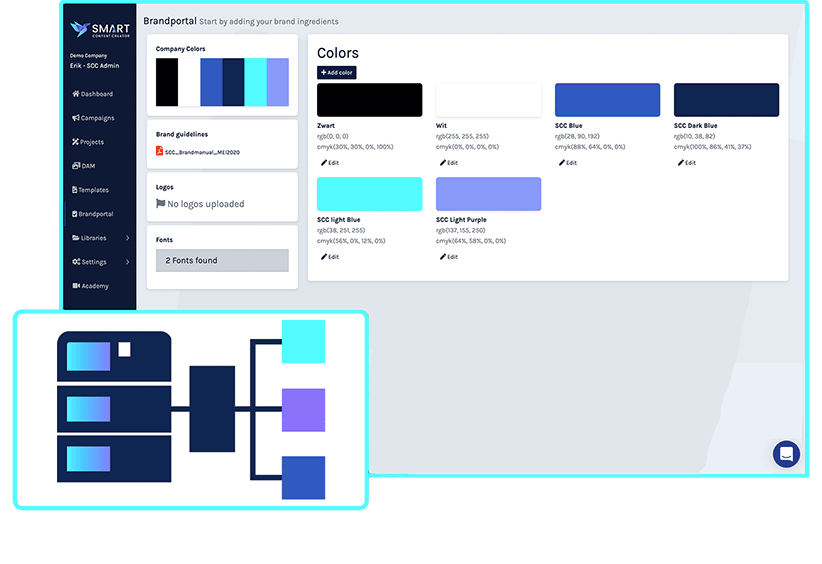 - Upload je logo’s en voeg eenvoudig de huisstijlkleuren toe.